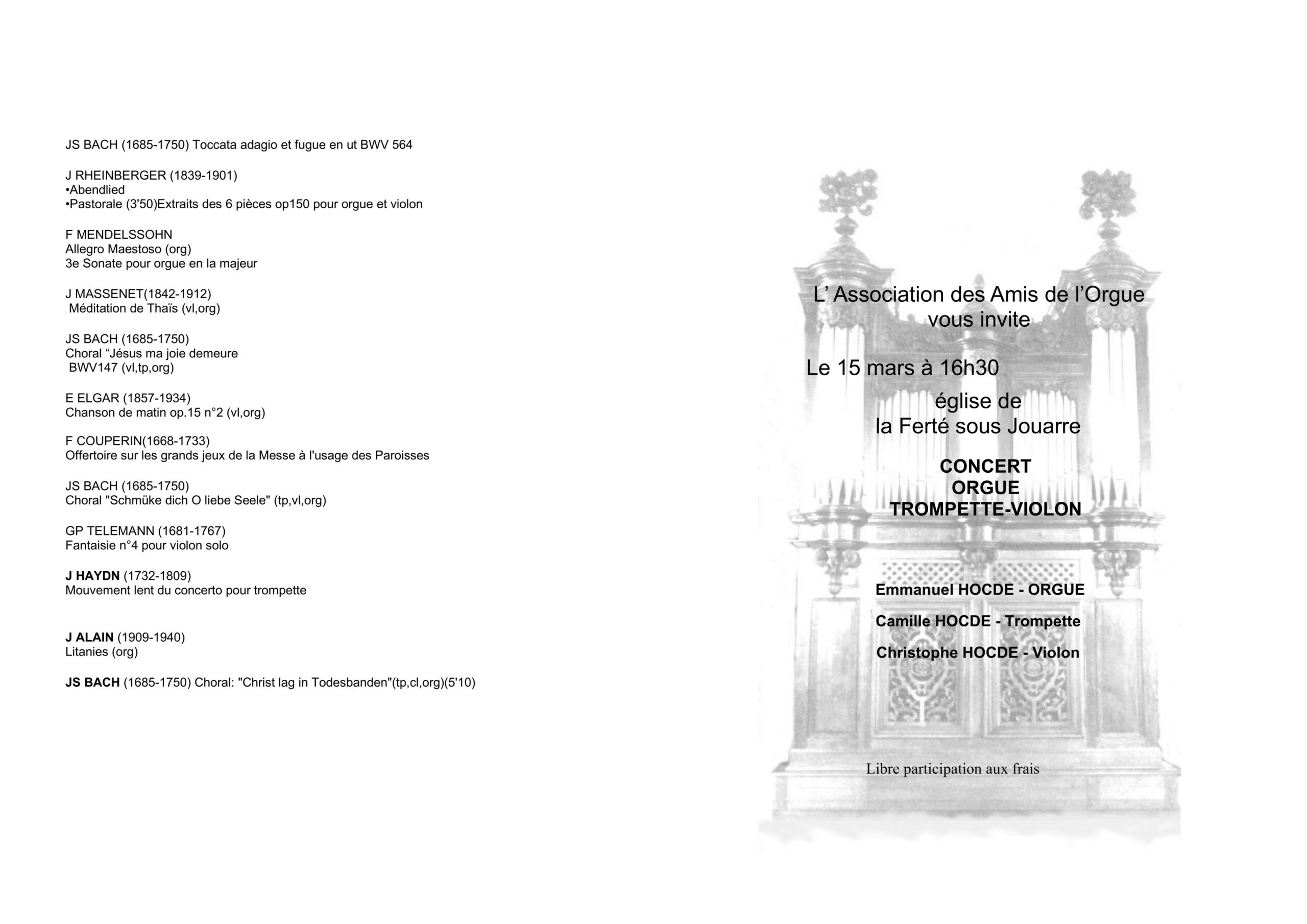 le 15 mars à 16 h 30 Trio Hocdé Bach, Telemann, Haydn, Mendelssohn, Rheinbeger…