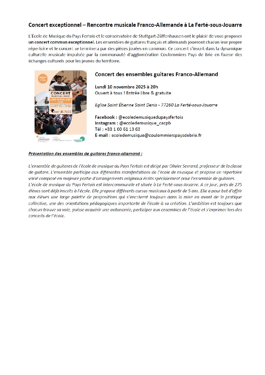 Read MoreLe 11 novembre 2025 à 20 h Concert exceptionnel – Rencontre musicale Franco-Allemande à La Ferté-sous-Jouarre L’École de Musique du Pays Fertois et…